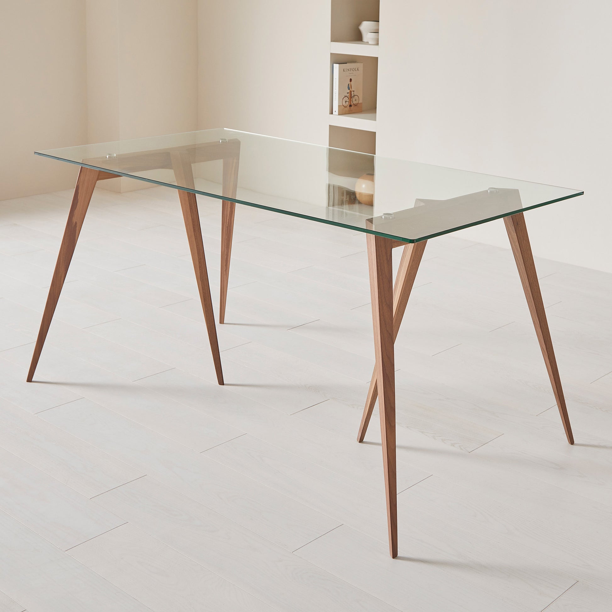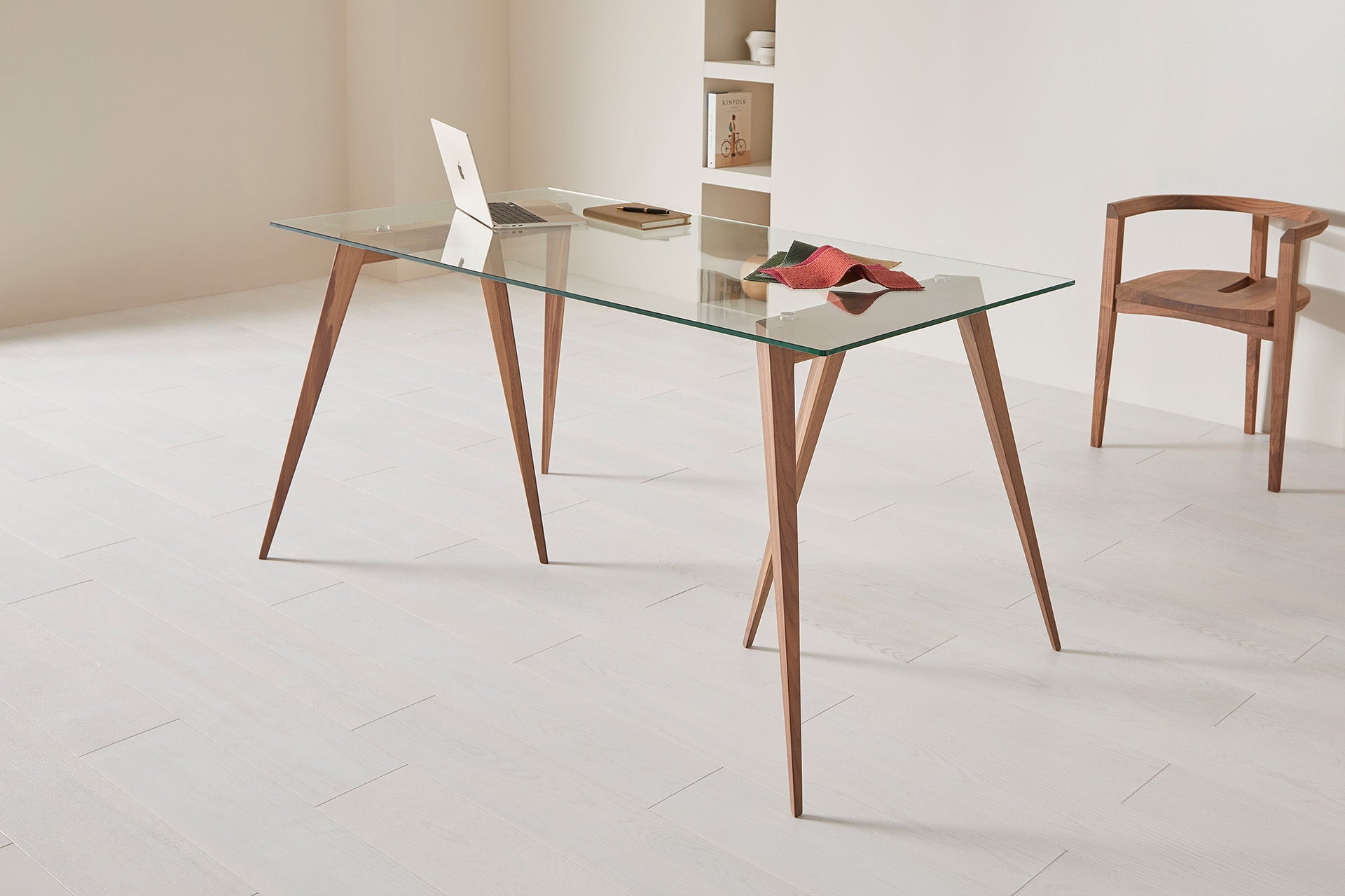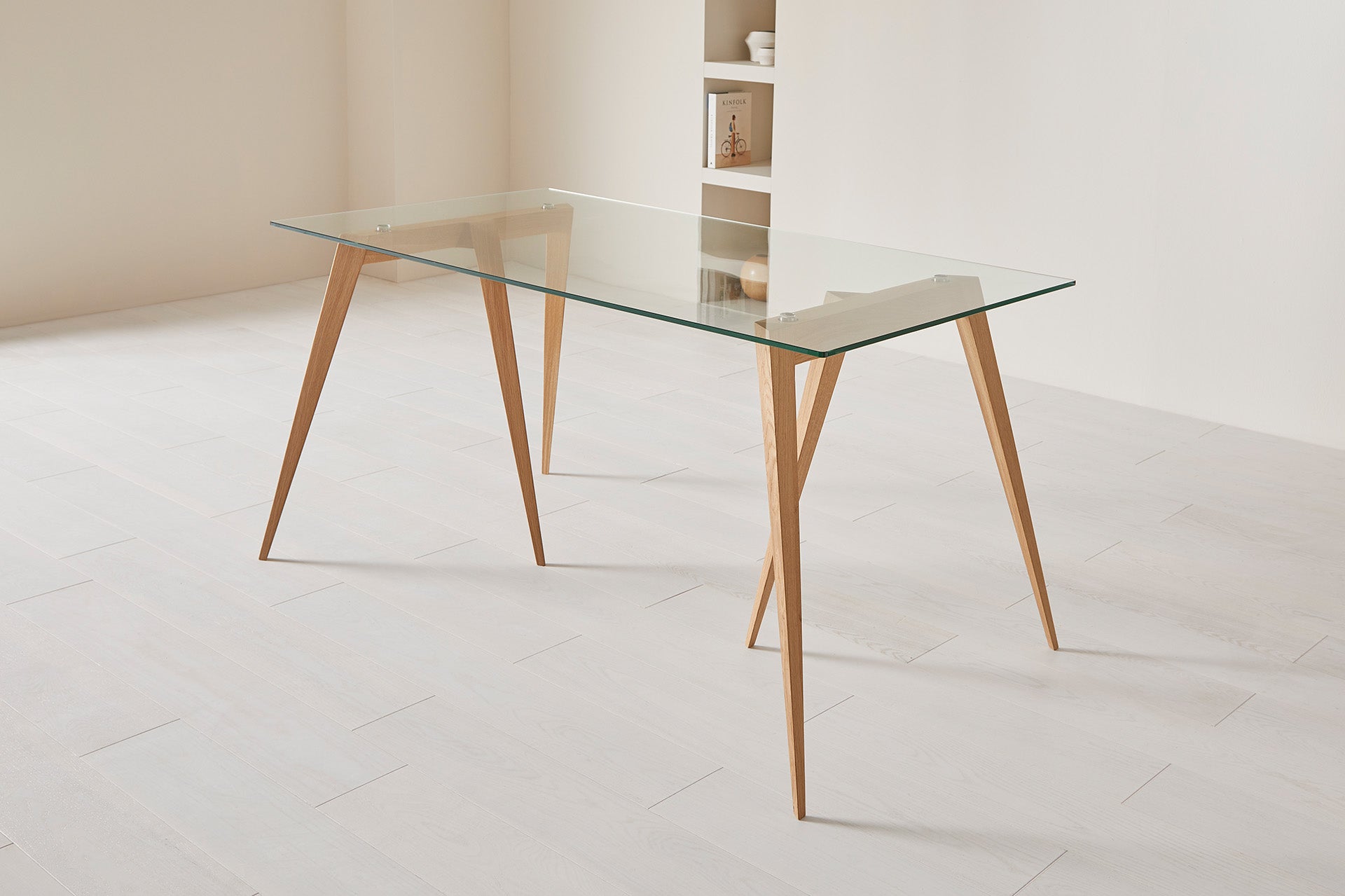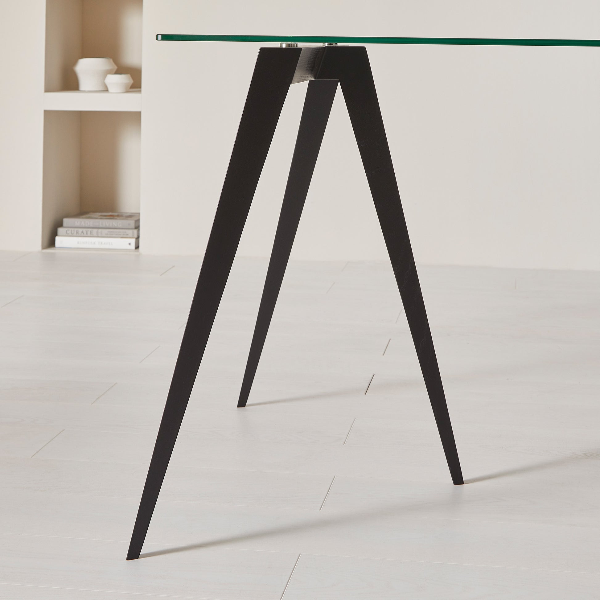 These contemporary wooden trestle desk legs look stunning with a glass top. They make a very attractive glass top tripod trestle desk or dining table. Stable and suitable for many uses.
