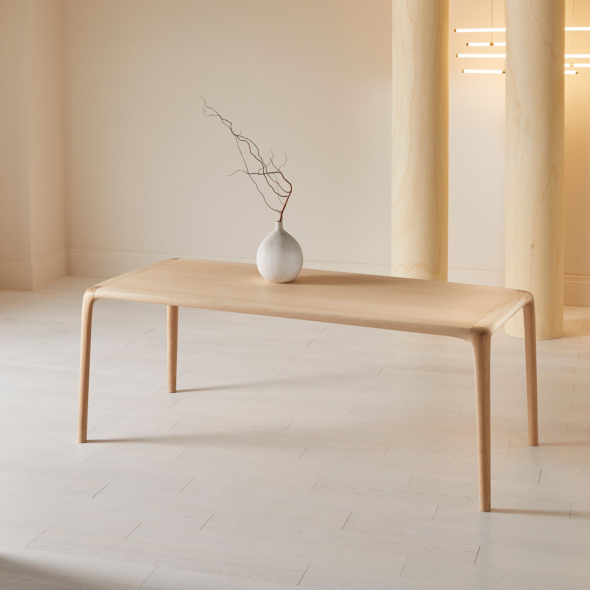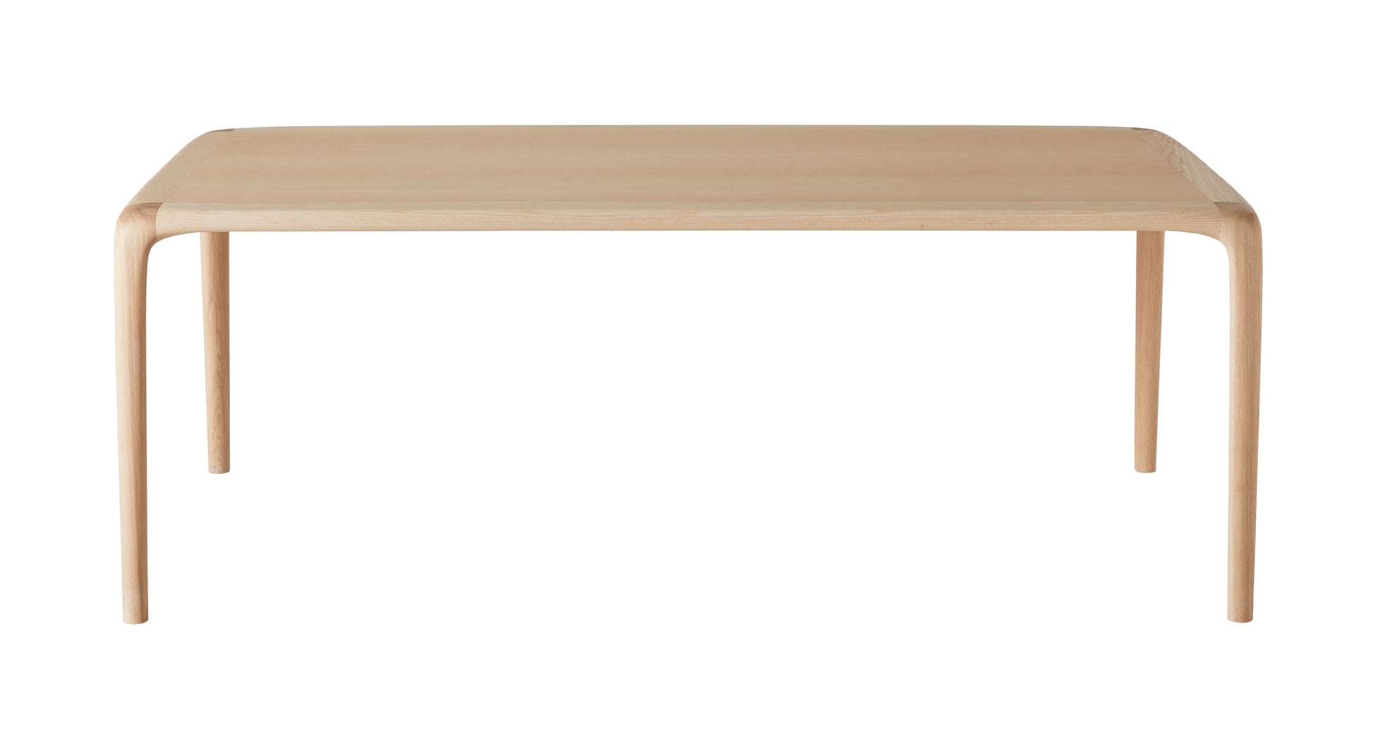 The tabletop forms a single, uninterrupted surface that flows into gently curved corner legs, creating a sense of movement while maintaining structural clarity. Its restrained form allows it to sit comfortably within both minimal and more layered interiors.